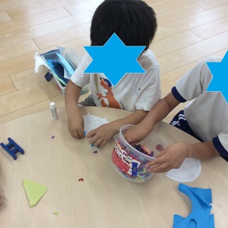 そろそろ6月も終わり、夏がやってくるので、スイカや金魚など夏を感じるイラストにちぎり絵で色を付けていきます。