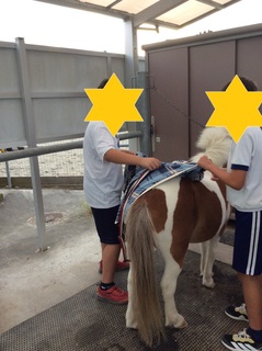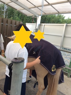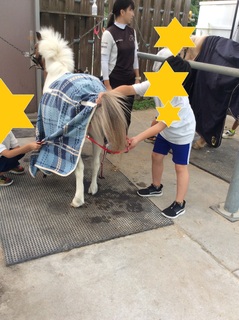 紐を止めるにも、絡まったりねじれたりしないように、首元を苦しく締めすぎないようにと、気を付けるポイントは多々あります!もちろん服を着せるルールだけではなく、いつものブラッシングや引き馬の時と同じく、後ろには立たない、足を踏まれない様にするなどなど、自分たちの動きも気を付けなければいません。