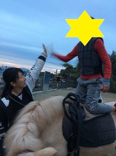 ジャンプだけでは難しいお友達は職員と力を合わせて馬の背に乗ります。