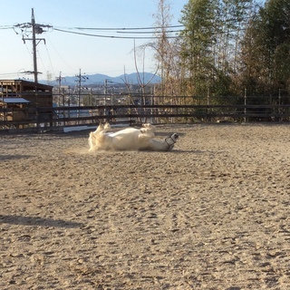 お掃除中の馬たちは馬場でリラックスモードでした。
