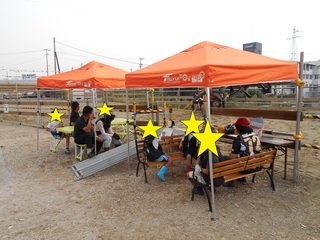 また、今週からテントが新しくなりました。今までは一つの大きなテントが馬乗り場を覆っていましたが、オレンジの小さな二つのテントに変わって、オシャレな椅子も加わりました。周りの見通しも良くなりましたね。